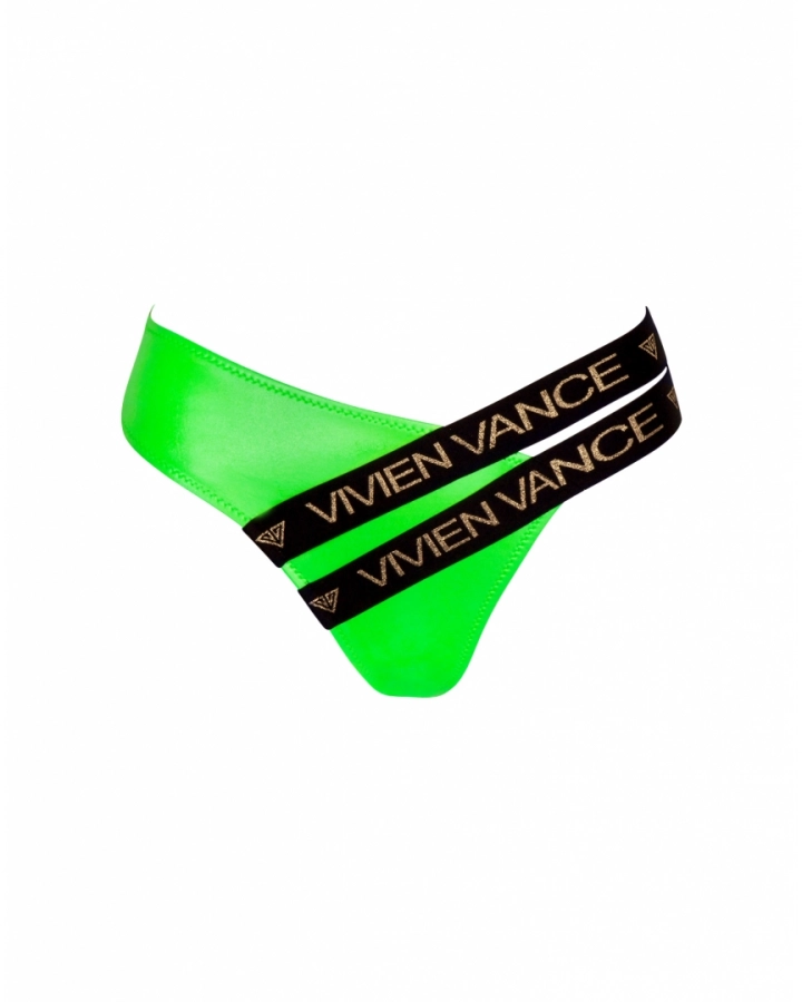 Low-waisted, latex-effect thong bikini bottom, decorated with two elastic branded straps on one side. Made with a material composition of 80% polyamide and 20% elastane, providing comfortable wear and a sexy appearance. And last but not least, the material adheres evenly to your body, so you don't have to worry about your shape.