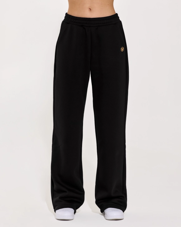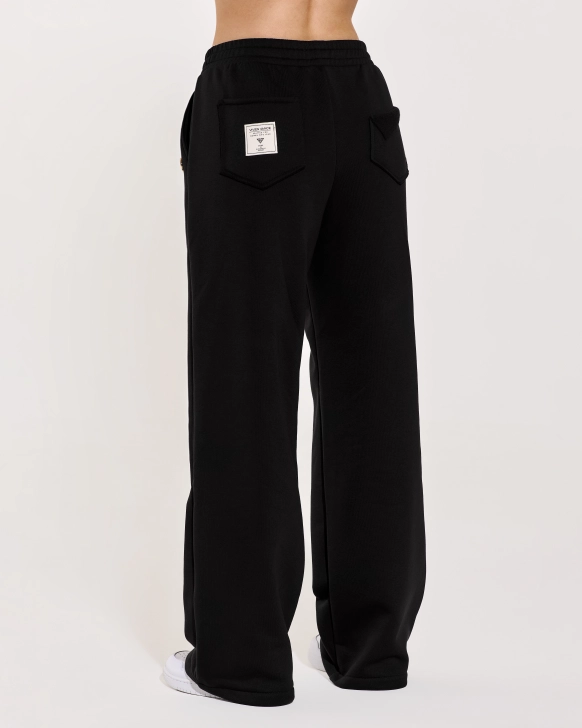 Pantaloni evazați, din material accolade călduros, care îmbină stilul atemporal cu detalii moderne. Textura moale și flexibilă oferă un confort excepțional, iar banda subtilă din lurex adaugă o strălucire rafinată, accentuând eleganța. Șnurul din talie evidențiază linia corpului, în timp ce buzunarele practice combină funcționalitatea cu stilul. Detaliul cu logo plasat sub buzunar completează perfect un look sofisticat, dar relaxat.
